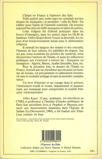 Avec près de 3 000 000 de musulmans, plus de 1 000 mosquées et lieux de prières, quelque 600 associations confessionnelles, l'Islam est la deuxième religion de l'Hexagone. Gilles Kepel retrace la progression de l'Islam en France depuis 1926, les querelles qui animent cette communauté plurinationale et les événements qui la soudent, les problèmes politiques, sociaux, économiques, qui l'opposent à la société française ou l'en rapprochent, le sensible regain des jeunes générations pour la religion de leurs pères, le débat entre insertion ou assimilation. Une étude lucide et sereine sur les musulmans en France, mais aussi un regard éloquent des musulmans sur la France, révélant des abîmes de malentendus de par et d'autre. Une enquête sur le terrain, un ouvrage de réflexion. Le livre de référence sur une question qui touche tous les points sensibles de la vie française.