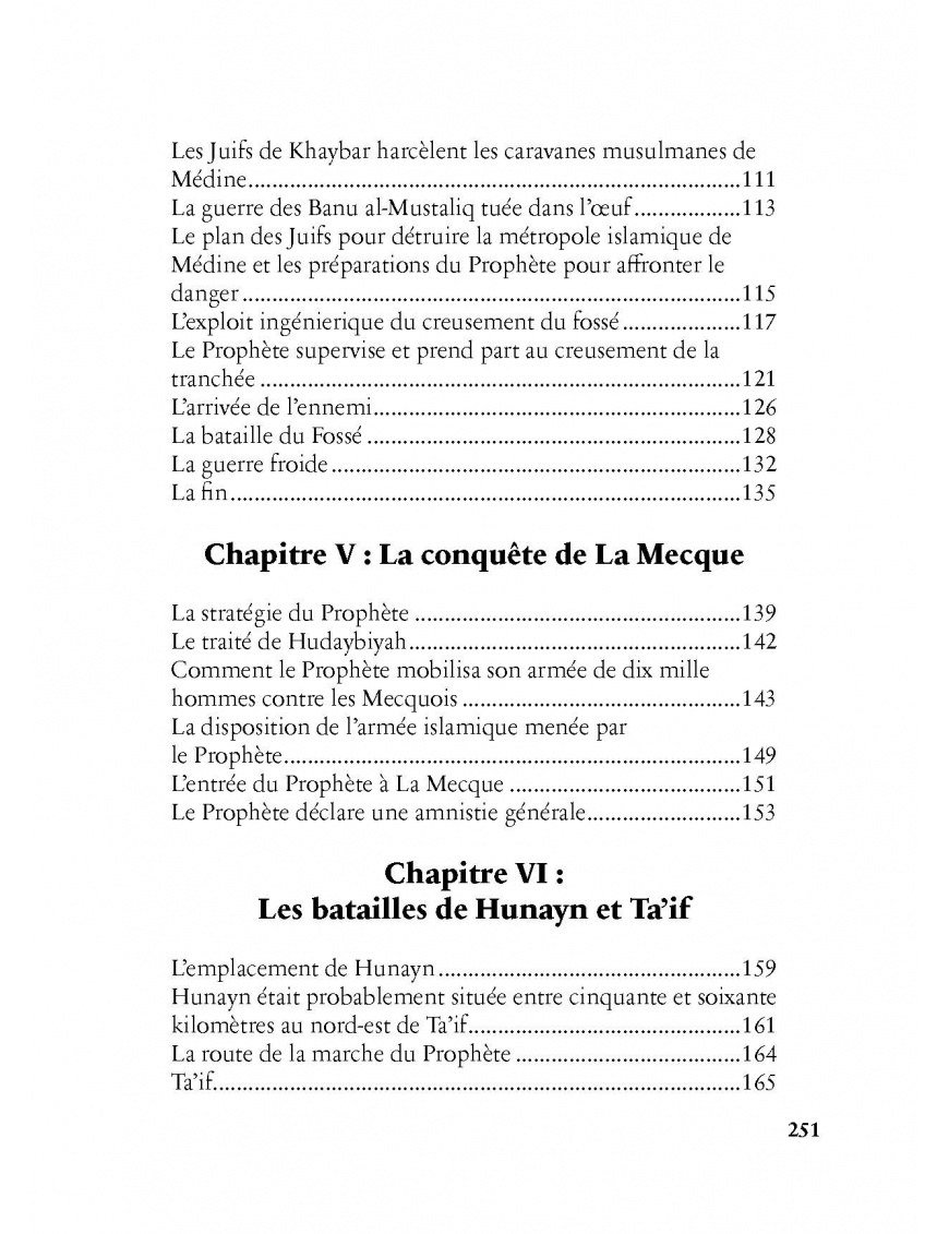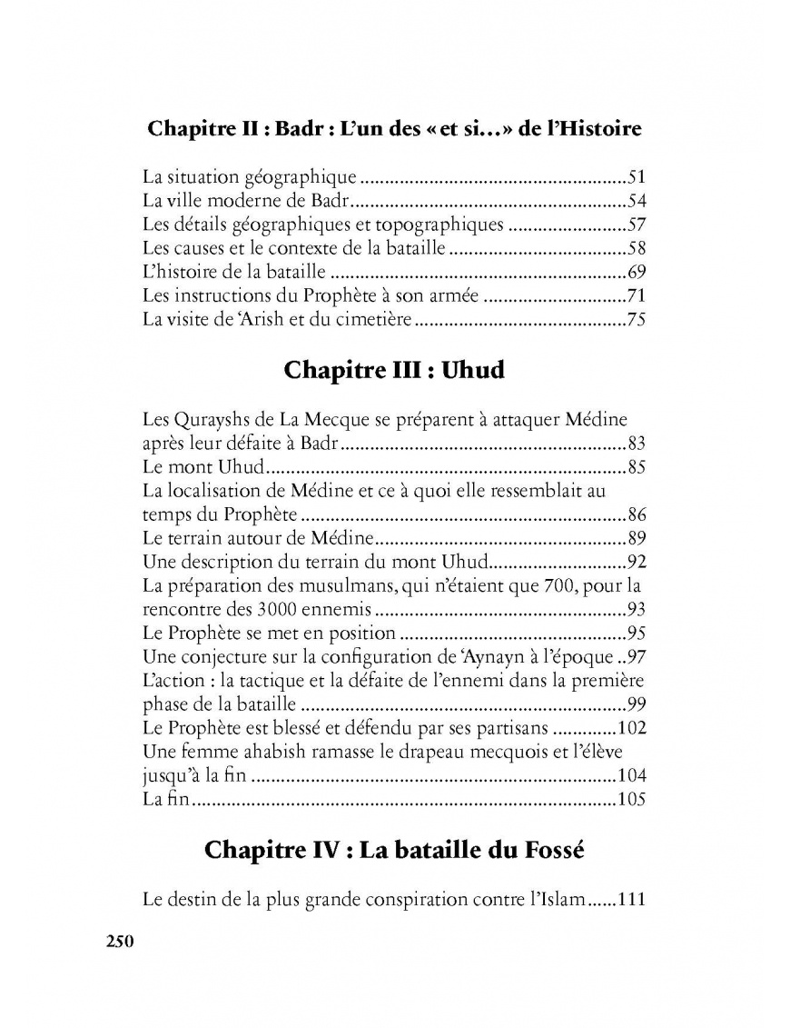 Enfin, il analyse une à une les grandes batailles ainsi que le système de renseignement et l’organisation de l’armée musulmane. Véritable document historique, politique et militaire qui permet de mieux comprendre la vie du Prophète et son apport à l’humanité