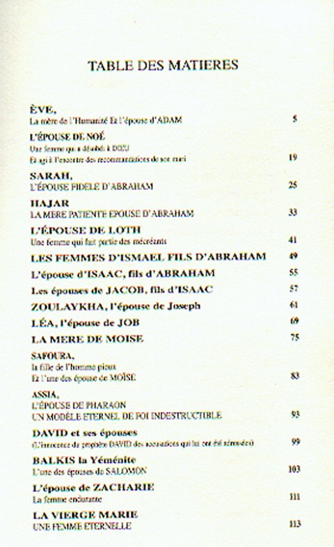 Cet ouvrage retrace la vie des épouses de quelques uns des Envoyés divins, parmi les plus connus dans les livres Saints. Parmi ces femmes, il y a eu des croyantes et des non-croyantes. Certaines d’entres elles ont reçu le titre de « Femmes éternelles ». Comme pour montrer que leur modèle de sainteté est intemporel, donc valable à toutes époques, telle qu’Assia, épouse de pharaon ou Marie (Maryam), fille d’Imran et mère de Jésus (Aïssa), leurs qualités : patience, fidélité… montreront le chemin de la sagesse jusqu’à la fin des temps.