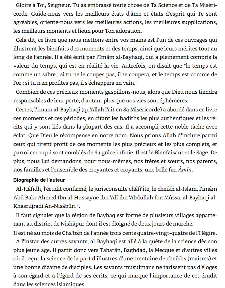 Dans cet ouvrage, l’Imam al-Bayraqî a rassemblé un grand nombre de hadiths et de traditions variées qui traitent des vertus des moments, des jours et des mois particuliers du calendrier musulman hégirien, où les actes d’adoration envers Allah sont particulièrement bénéfiques sur le plan spirituel et hautement récompensés.