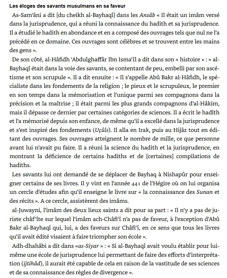 Al-Bayhaqî, éminent traditionniste et faqîh Shafi’ite, né en 994 J.C. en Perse, fut un érudit d’envergure ayant étudié avec de nombreux Shaykhs. Sa prolifique production littéraire comprend environ mille fascicules, dont le célèbre «Kitâb al-Sunan al-Kubrâ » en dix volumes, loué pour sa perfection. Sa vie fut dédiée à la préservation de la tradition islamique. Il décéda en 458/1066 à Naysâbûr, laissant un héritage intellectuel durable dans la pensée islamique.