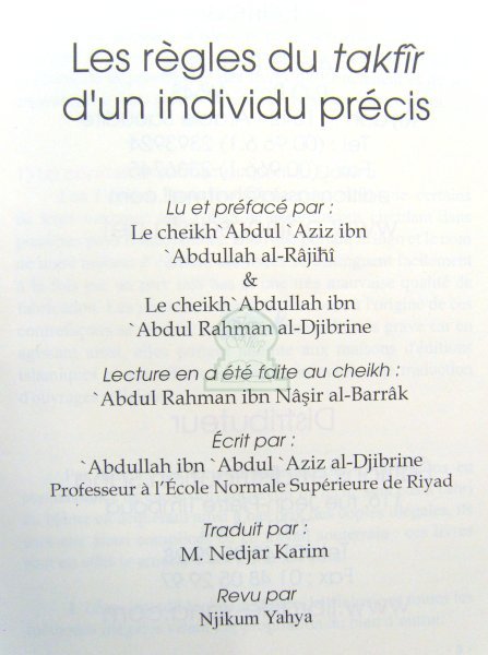 Dans ce livre le Cheikh Abdallah Ibn Abdelaziz al-Jibrine nous propose et nous explique les conditions et les règles pour qualifier un individu précis de kafir.