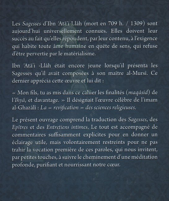 Les Sagesses d'Ibn 'Atâ'i-Llâh as-Sakandarî (mort en 709h./1309) sont aujourd'hui universellement connues. Elle doivent leur succès au fait qu'elles répondent, par leur contenu, à l'exigence qui habite toute âme humaine en quête de sens, qui refuse d'être pervertie par le matérialisme. Traduction et commentaires d'Hani Ramadan.