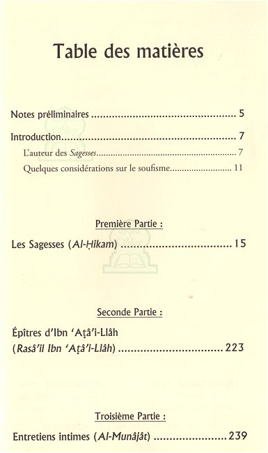 Cet ouvrage comprend la traduction des Sagesses, des Epîtres et des Entretiens intimes d'Ibn 'Atâ'i-Llâh. Le tout est accompagné de commentaires suffisamment explicites pour en donner un éclairage utile, mais volontairement restreints pour ne pas trahir la vocation première de ces paroles, qui nous invitent à suivre le cheminement d'une méditation profonde, purifiante et nourrissant notre coeur.