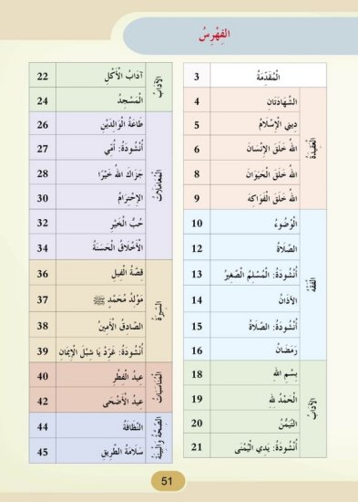 القرآن الكريم: يحتوى الكتاب على بعض سور القرآن الكريم من جزء عم بحيث توفر على التلميذ عناء حمل المصحف معه :إلى المدرسة ، وهذه السور كالآتي