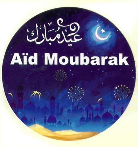 Lot de 12 grands autocollants ronds "Aid Moubarak" bilingue (français/arabe) pour Cadeaux de l'Aid - Stickers autocollants de 6 cm - REF. 28668 (1.90 €)