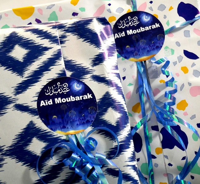 Pack de 21 autocollants "Aid Moubarak" bilingues (français/arabe - 6 cm) pour cadeaux musulman - Stickers Eid Mubarak - عيد مبارك - REF. 28666 (1.90 €) - En Promotion à 1.30 €
