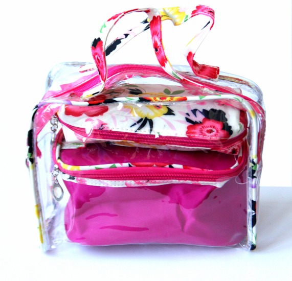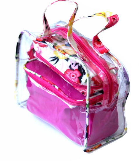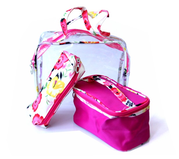 Ensemble de trois Trousses assorties spécial produits de beautés et maquillage. Ces trousses assorties sont de couleur rose fuchsia avec motifs fleurs.