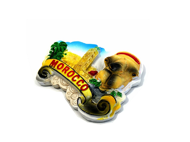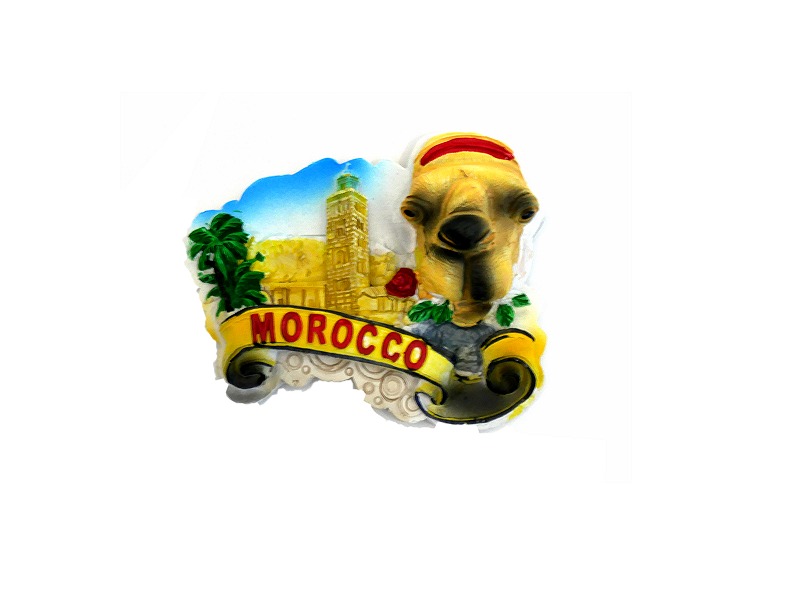 Magnet artisanal avec tete de chameau et monument marocain en relief 3D (inscription Morocco)