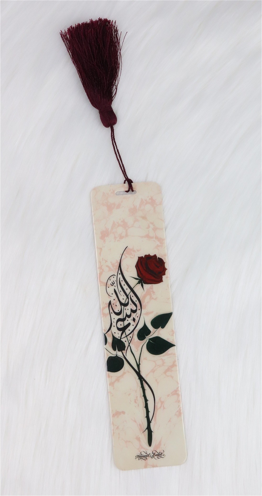 Marque-page avec la basmala "Bismilllah" calligraphiee dans une fleur et pompon en sabra bordeaux