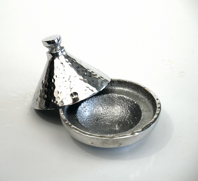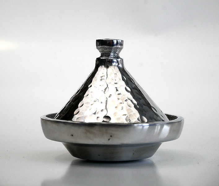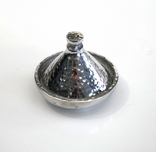 Mini tajine décoratif, provenant de Marrakech (Maroc), en aluminium argenté.