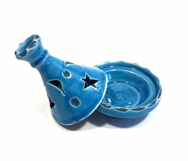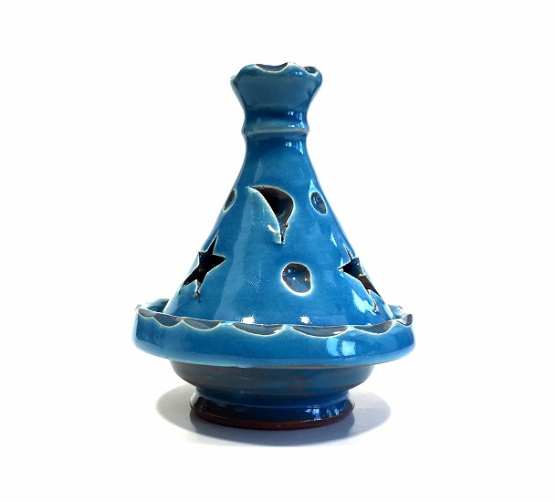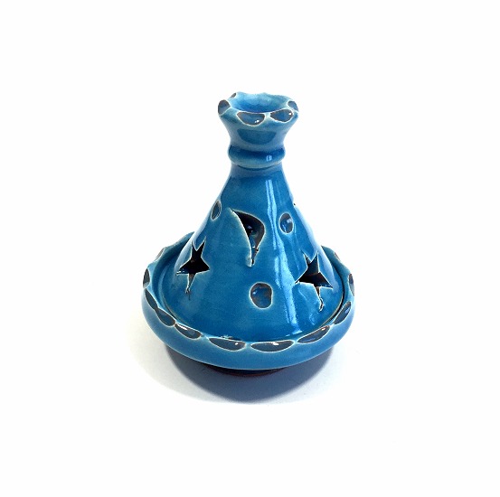 Mini tajine photophore décoratif, provenant de Marrakech (Maroc), en terre cuite, peint en bleu clair, émaillé, et orné de jolies ciselures lancéolées...