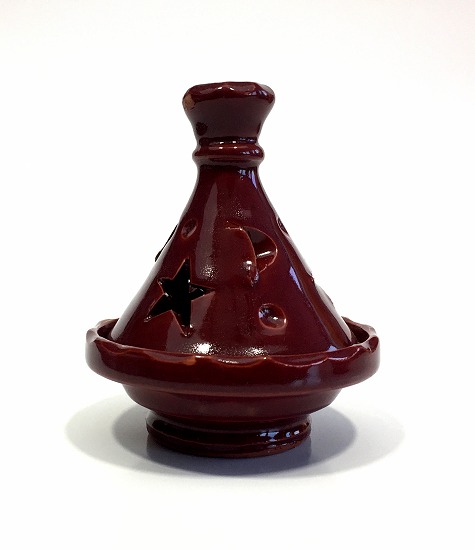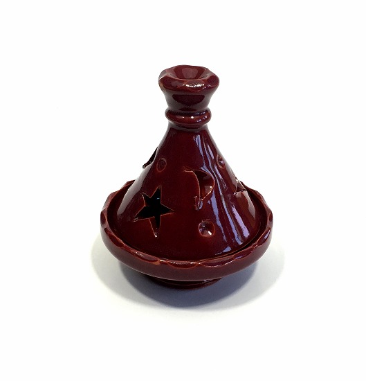 Mini tajine photophore décoratif, provenant de Marrakech (Maroc), en terre cuite, peint en couleur bordeaux, émaillé, et orné de jolies ciselures en forme d'étoile et de croissant lunaire...