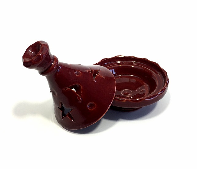 Mini tajine photophore decoratif marocain en poterie de couleur bordeaux emaille et orne de ciselures