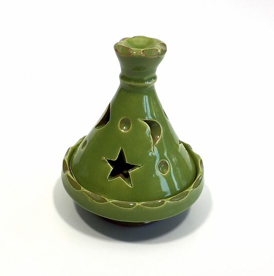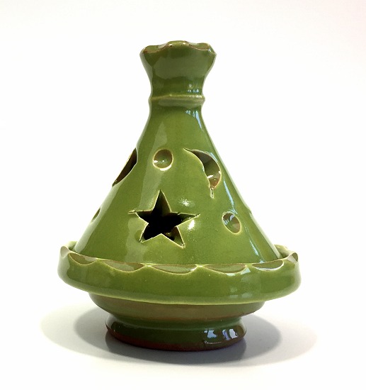 Mini tajine photophore décoratif, provenant de Marrakech (Maroc), en terre cuite, peint en vert clair, émaillé, et orné de jolies ciselures lancéolées...