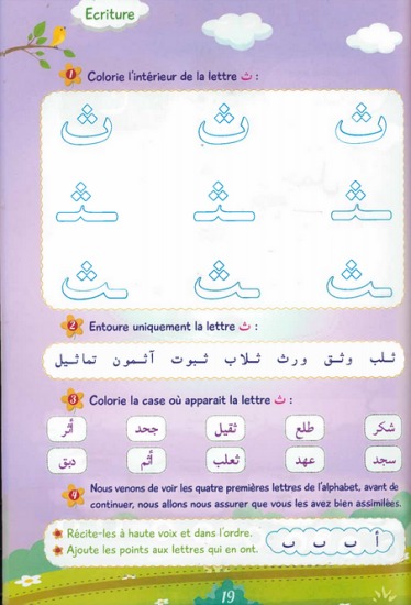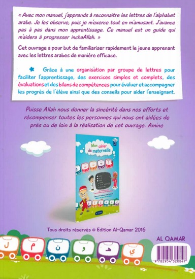 Avec mon manuel, j'apprends à reconnaitre les lettres de l'alphabet arabe,je les observe, puis je m'exerce tout en m'amusant. j'avance pas à pas dans mon apprentissage. ce manuel est un guide qui m'aidera a progresser inchAllah.