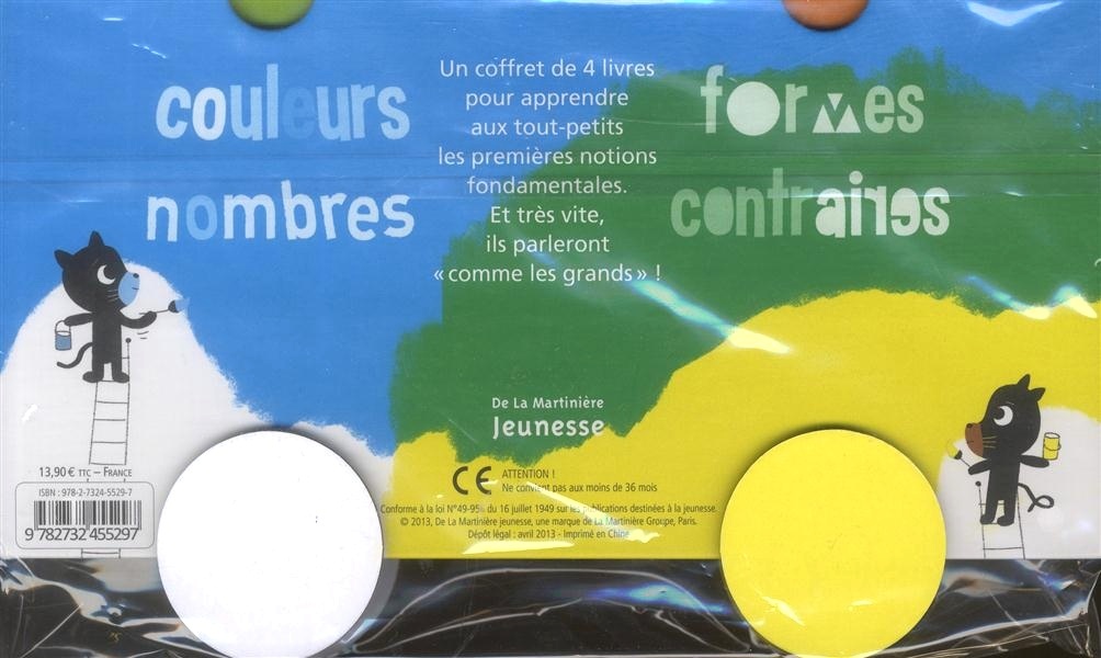 Quatre livres tout-carton dans un coffret pour éveiller les petits ! Chaque livre, avec ses 6 doubles-pages, permet un apprentissage très précis et clair. L’enfant apprend les couleurs, puis les formes, les nombres et les contraires sans avoir à assimiler trop de notions à la fois. Un livre = une notion. Le format est également spécialement adapté aux petites mains de bébé. C'est un projet qui se positionne comme étant un objet de pur apprentissage, mais pas uniquement ! L'illustrateur a travaillé ses images de façon humoristique et tendre.