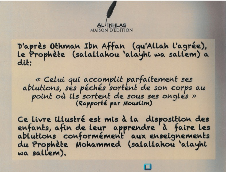 Ce livre, joliment illustré,mis a la disposition des enfants, afin de leur apprendre à faire les ablutions conformément aux enseignements du Prophète Mohammed (paix et bénédictions sur lui).