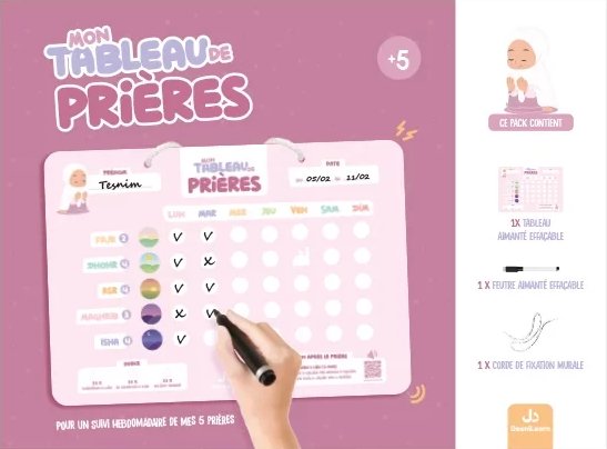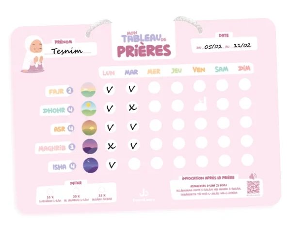 Découvrez notre tableau de suivi innovant dédié aux enfants, spécialement conçu pour les motiver et les accompagner dans l’accomplissement des 5 prières quotidiennes.