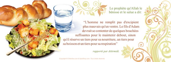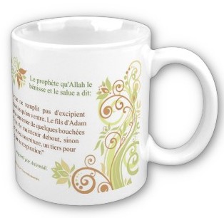 Mug avec le hadith suivant (excellent rappel quand on mange) : Le prophète qu'Allah le bénisse et le salue a dit: “L'homme ne remplit pas d'excipient plus mauvais qu'un ventre. Le fils d'Adam devrait se contenter de quelques bouchées suffisantes pour le maintenir debout, sinon qu'il réserve un tiers pour sa nourriture, un tiers pour sa boisson et un tiers pour sa respiration” rapporté par Attirmidi. Notez que le contenu de ce hadith est confirmé par la médecine moderne et fait parti des miracles prophétiques du dernier Messager (SAW).