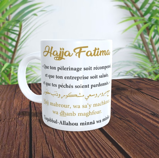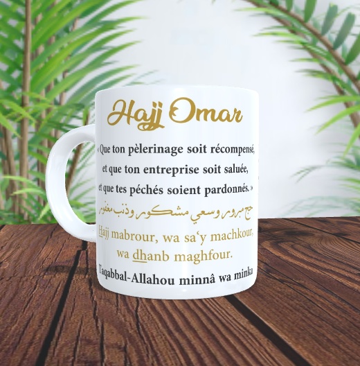 Mug contenant l'invocation (du'a) en arabe qu'il faut dire au pèlerin (hajj ou hajja) à l'occasion du retour du pèlerinage : "Que ton pèlerinage soit récompensé, et que ton entreprise soit saluée, et que tes péchés soient pardonnés."
