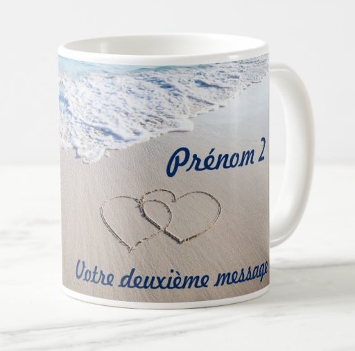 Mug Personnalise avec prenom(s) / message(s) de votre choix (Plage et deux coeurs dessines sur le sable)