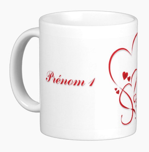 Mug cadeau avec coeur incrusté au niveau de l'anse personnalisé avec 2 prénoms et l'illustration du coeur de votre choix (Pour couple) - REF. 24375 (13.90 €)