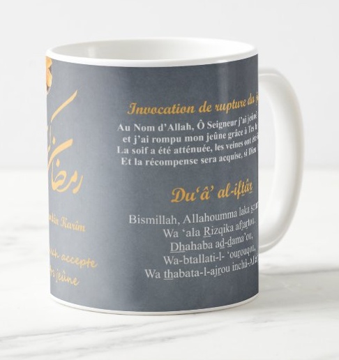 Mug pour la rupture du jeûne et inscription Ramadan Karim (Bon Ramadan) et français et arabe + invocation de rupture du jeune (Dou'a al iftâr). Qu'Allah accepte votre jeûne à tous durant le mois de Ramadan et durant le reste des jours de l'année où vous jeûnerez.