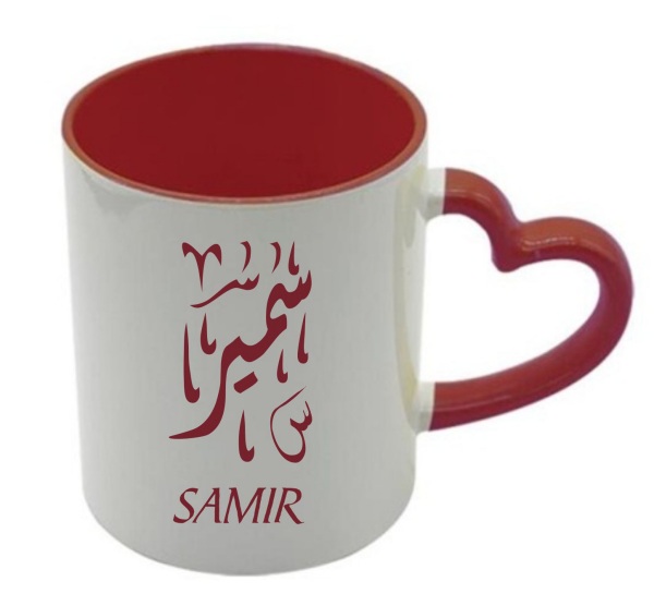 Profitez de recevoir cette tasse avec anse (poignée sous forme de coeur et intérieur couleur bordeaux) avec l'inscription du prénom calligraphié en arabe et/ou en français ou un message en français. S'il s'agit d'un prénom, vous pouvez choisir un style parmi les quatre (voir image ci-dessous).
