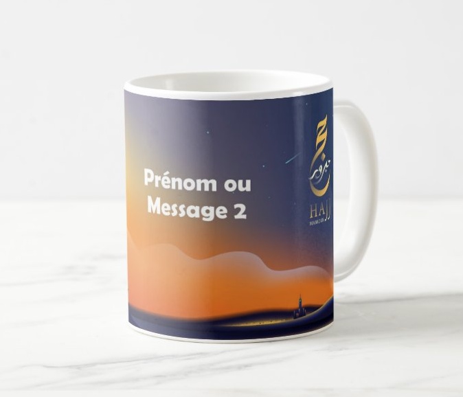 Mug personnalisé à offrir aux pèlerins 2025 (Haj/Haja) avec 2 messages ou prénom et invocation du pèlerin - REF. 24526 (9.90 €)