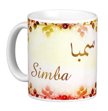 Mug avec le prénom "Simba" écrit en français, en arabe (سمبا) et calligraphié de façon artistique en arabe sur la partie droite.