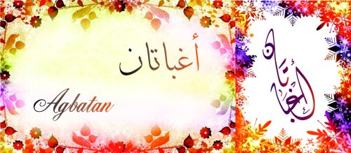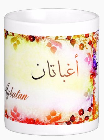 Mug avec le prénom "Agbatan" écrit en français, en arabe (اغبتان) et calligraphié de façon artistique en arabe sur la partie droite.
