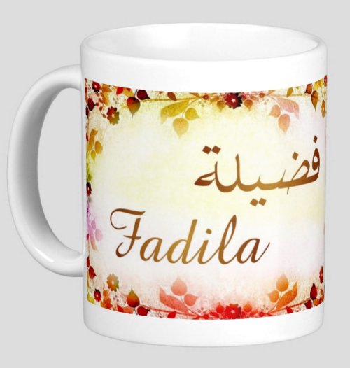 Mug avec le prénom "Fadila" écrit en français, en arabe (فضيلة) et calligraphié de façon artistique en arabe sur la partie droite.