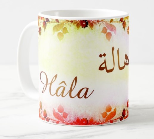 Mug avec le prénom "Hâla" écrit en français, en arabe (هالة) et calligraphié de façon artistique en arabe sur la partie droite.