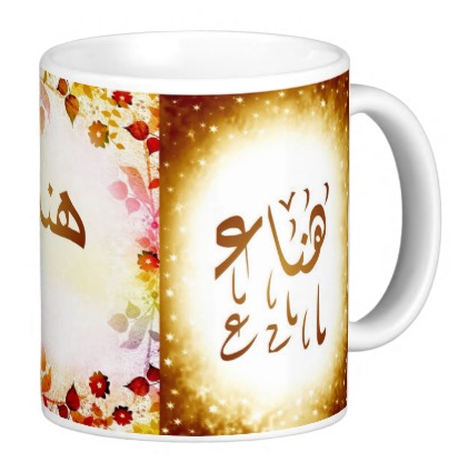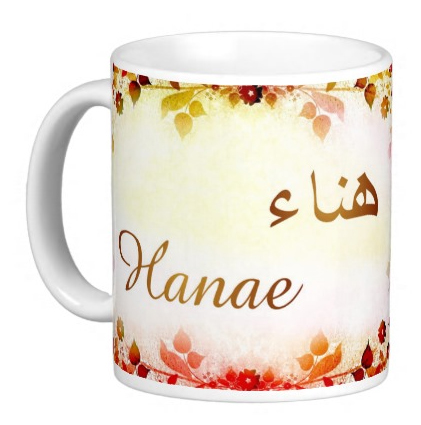 Mug avec le prénom "Hanae" écrit en français, en arabe (هناء) et calligraphié de façon artistique en arabe sur la partie droite.