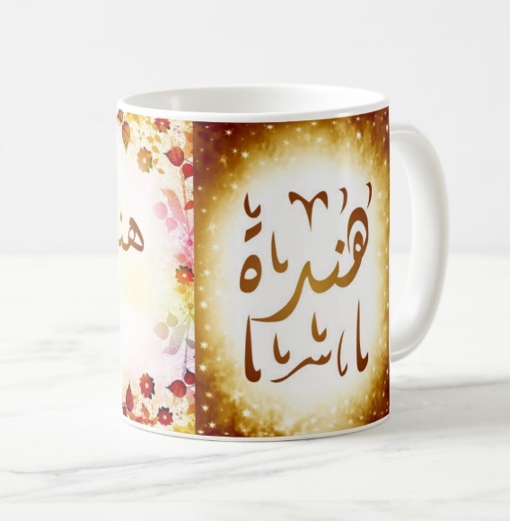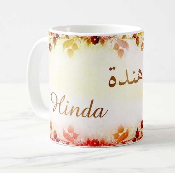 Mug avec le prénom "Hinda" écrit en français, en arabe (هندة) et calligraphié de façon artistique en arabe sur la partie droite.