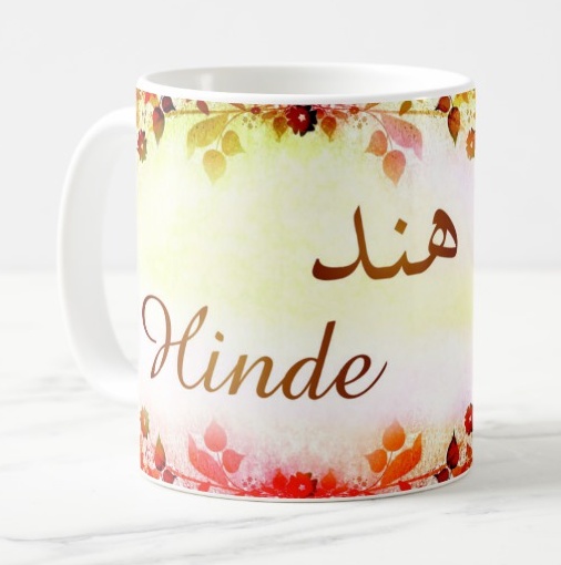 Mug avec le prénom Hinde calligraphié en arabe ainsi que son écriture normale en arabe (هند) et en français.