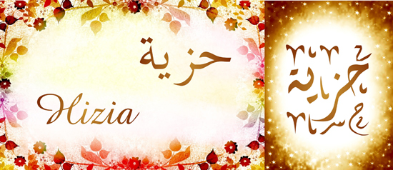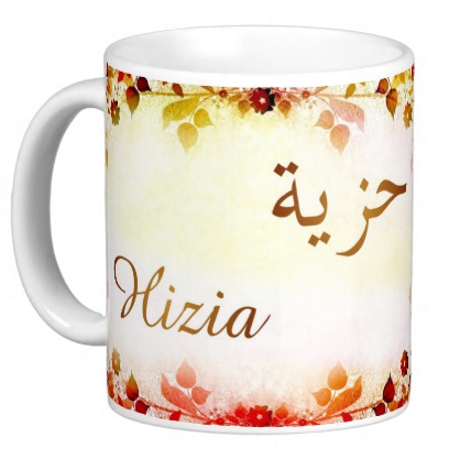 Mug avec le prénom "Hizia" écrit en français, en arabe (حزية) et calligraphié de façon artistique en arabe sur la partie droite.