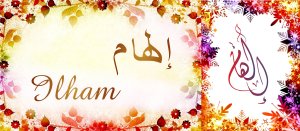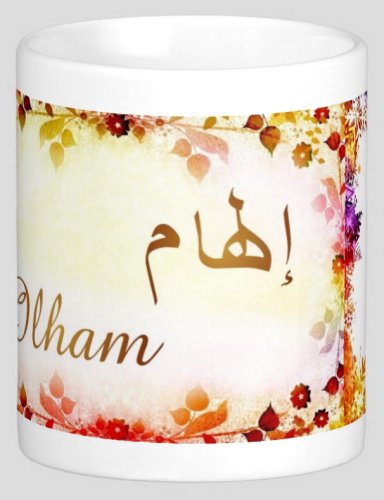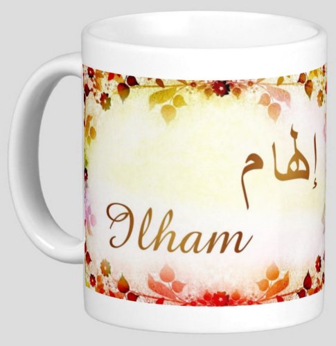 Mug avec le prénom "Ilham" écrit en français, en arabe (إلهام) et calligraphié de façon artistique en arabe sur la partie droite.