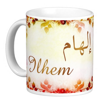 Mug avec le prénom "Ilhem" écrit en français, en arabe (إلهام) et calligraphié de façon artistique en arabe sur la partie droite.