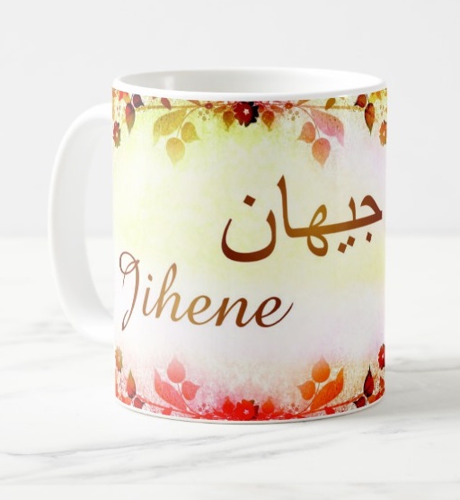 Mug avec le prénom Jihene calligraphié en arabe ainsi que son écriture normale en arabe (جيهان) et en français.