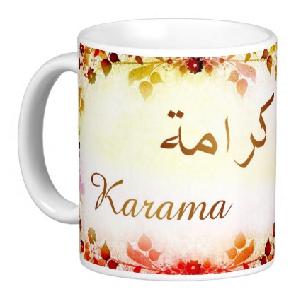 Mug avec le prénom "Karama" écrit en français, en arabe (كرامة) et calligraphié de façon artistique en arabe sur la partie droite.