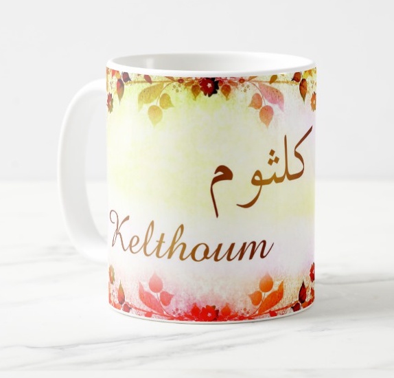 Mug avec le prénom "Kelthoum" écrit en français, en arabe (كلثوم) et calligraphié de façon artistique en arabe sur la partie droite.