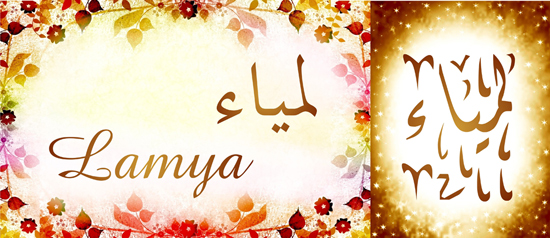 Signification (sens) du prénom Lamyâ’ (Lamya, Lamia) لَمْيَاء: Ce prénom arabe désigne une jeune fille d’une beauté lumineuse, chatoyante. Lamyâ’ comporte un homonyme, dont l’orthographe en arabe n’est pas la même, mais qui se prononce de la même façon, dans ce cas, Lamia signifie « la jeune fille aux lèvres rouges ou foncées ».