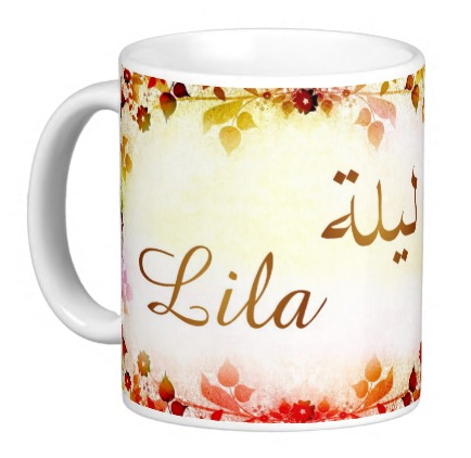 Mug avec le prénom "Lila" écrit en français, en arabe (ليلة) et calligraphié de façon artistique en arabe sur la partie droite.