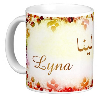 Mug avec le prénom "Lyna" écrit en français, en arabe (لينا) et calligraphié de façon artistique en arabe sur la partie droite.
