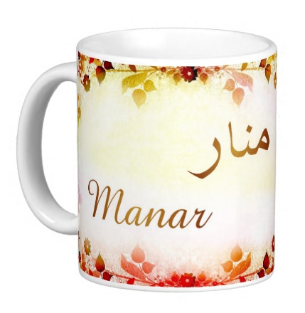 Mug avec le prénom "Manar" écrit en français, en arabe (منار) et calligraphié de façon artistique en arabe sur la partie droite.