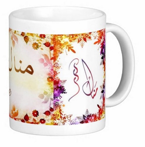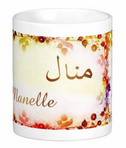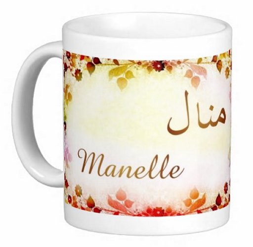 Mug avec le prénom "Manelle" écrit en français, en arabe (منال) et calligraphié de façon artistique en arabe sur la partie droite.