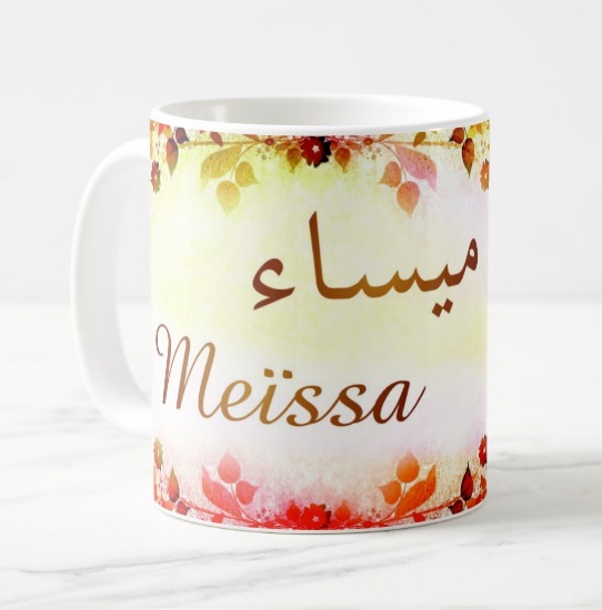 Mug avec le prénom "Meïssa" écrit en français, en arabe (ميساء) et calligraphié de façon artistique en arabe sur la partie droite.