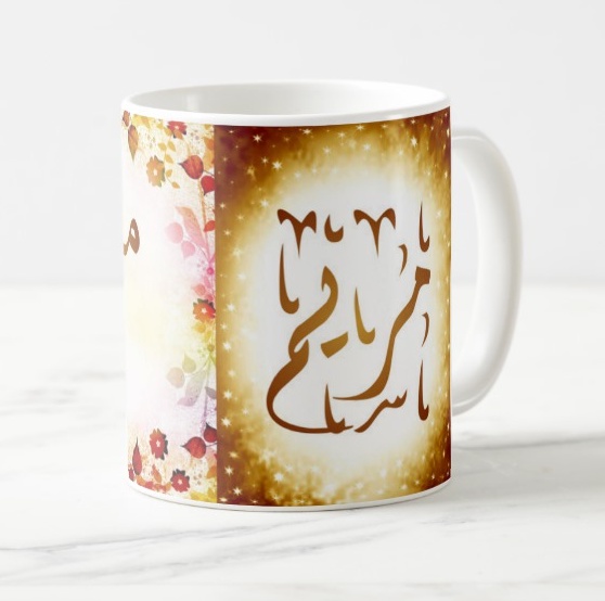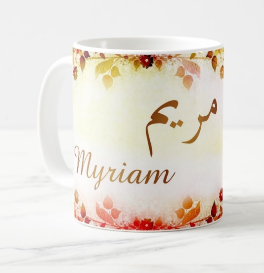 Mug avec le prénom "Myriam" écrit en français, en arabe (مريم) et calligraphié de façon artistique en arabe sur la partie droite.